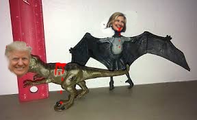 a beam of orange light shot out of his bald head. it hit hilladactyl right i the eyes. she fell to the ground, blinded. “i can’t see..” she said as trumpasaurus rex stomped closer. he stared her with glowing eyes. “i won the election” he whispered. hilladactyl screamed “IMPOSSIBLE” as trumpasaurus rex laughed. “hahaha.. you knew i would win! you were just denying it. you could have won, but the voters powered my orange forehead beam”. hilladactyl was blind. she would never regain sight. trumpasaurus stomped closer, and right when he was about to bite her, a meteorite struck and killed both of them THE END!!!!